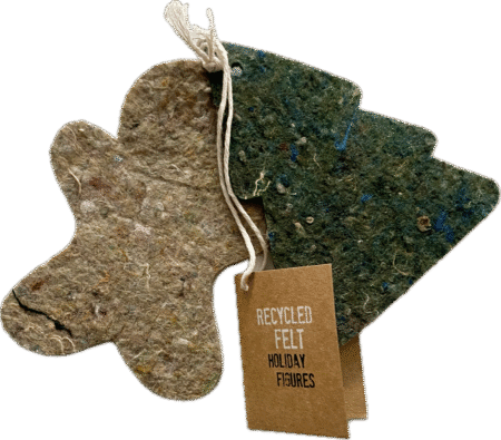 Dit is wel een heel leuk en verantwoord Kerstgeschenkje…voor in de boom, als onderzetter, boekenlegger of gewoon als gezellige versiering. Een duurzame boom en gezellig peperkoekmannetje. Maar eet ‘m niet op want hij is gemaakt van oude kleding…