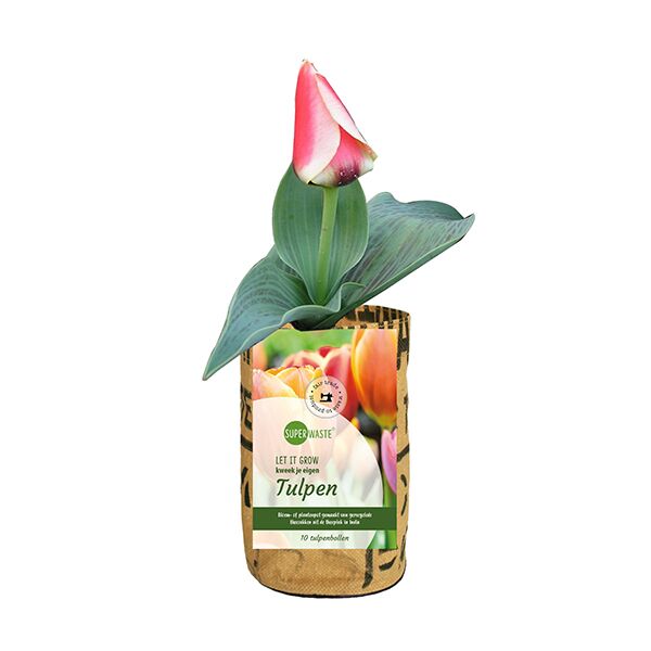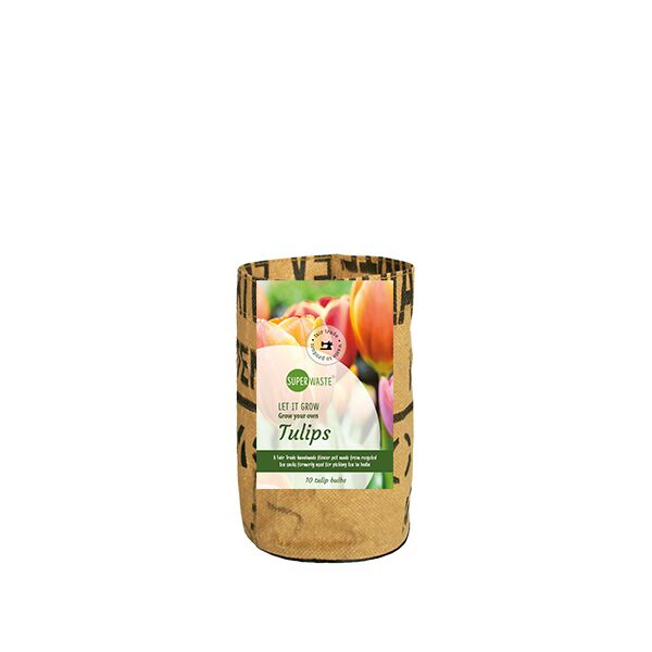 Kweek in de tuin, op het balkon of de vensterbank prachtige tulpen! Deze bloem- en plantenpot bevat 10 tulpenbollen. Op de achterkant van het label staat beschreven hoe de bollen gekweekt kunnen worden. De pot is Fair Trade gemaakt van zgn. ‘rags’, gebruikte theezakken uit de theepluk in India. Na de thee-oogst worden de zakken vaak weggegooid of verbrand, nu krijgen deze een tweede leven in het werkgelegenheidsproject van Superwaste. Elke kweekzak is uniek, doordat elke zakje bedrukt is met een andere print.  Let wel op, het potje is niet waterdicht!