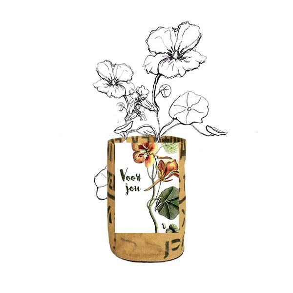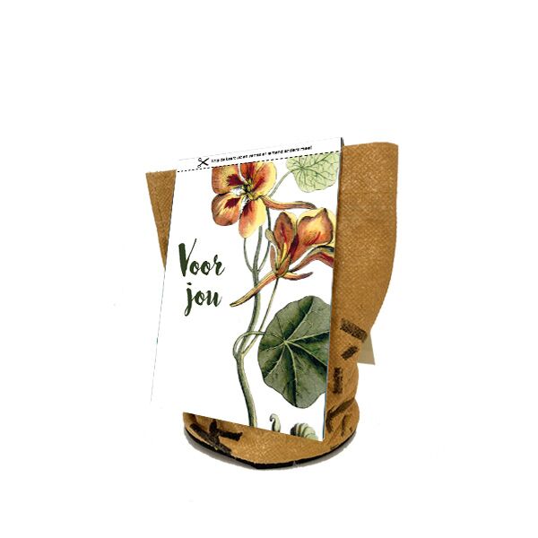 Een kweektuin met een extraatje! Knip de ansichtkaart van de labelkaart en verstuur hem naar iemand. Dit kweektuintje bevat aardetabletten en een zaadzakje Oost-Indische kers. Op de achterkant van het label staan de plantinstructies vermeld.